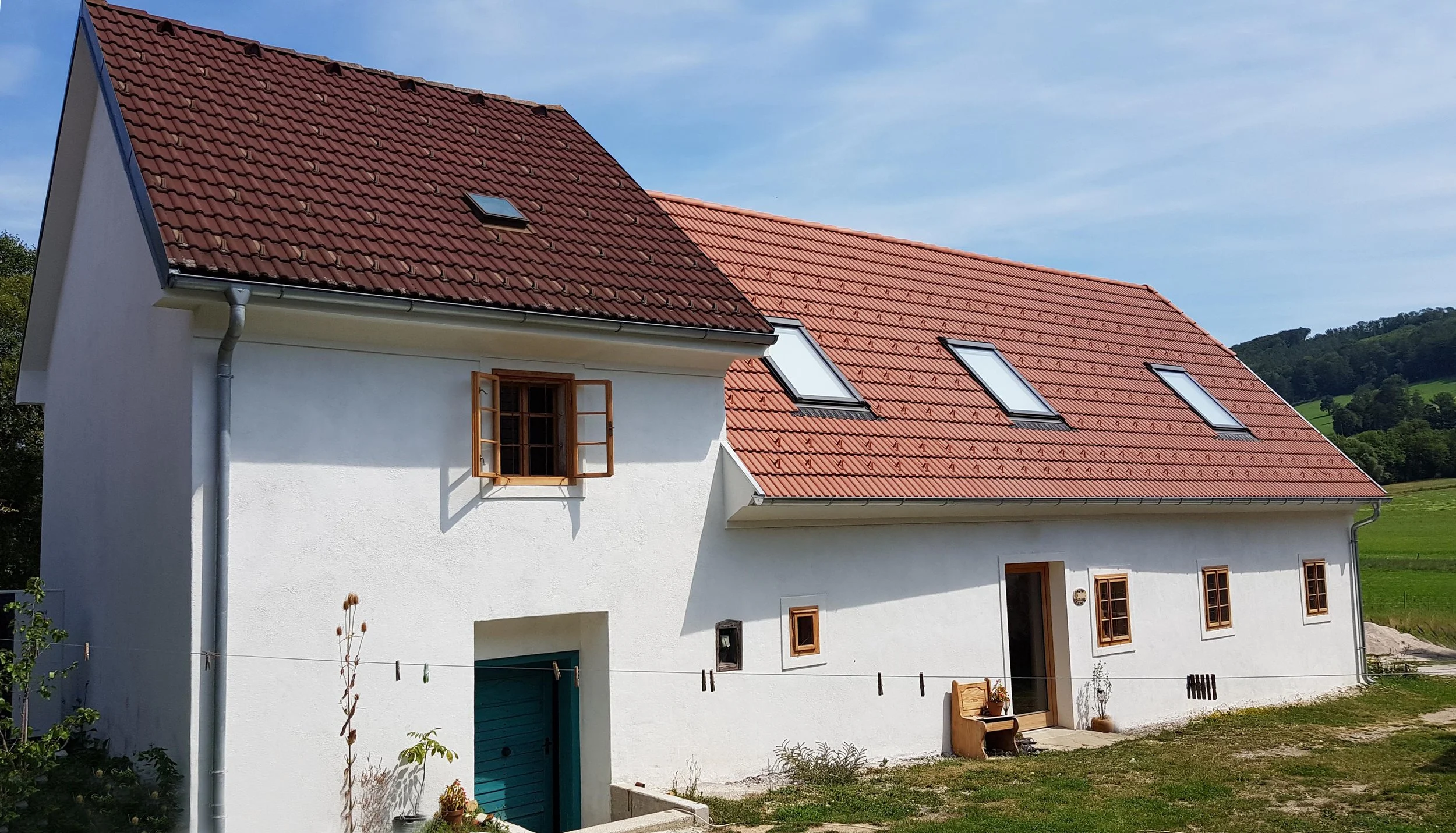 Ziel des Projekts war es, den ursprünglichen Charme und die Qualitäten des alten Bauernhauses zu erhalten und gleichzeitig ein modernes und behagliches Raumkonzept zu verwirklichen. Das Erdgeschoß blieb räumlich weitgehend erhalten, hier wurden nur die Fußböden ausgekoffert um zum Erdreich hin zu dämmen und einen neuen Fussbodenaufbau samt Fussbodenheizung unterzubringen. Die Mitte des Hauses war schon sehr in Mitleidenschaft gezogen, hier mussten Teile der Außenwände neu gemauert werden - und die Möglichkeit in der Küche ein großes neues Fenster einzusetzen und gleich noch die Holzdecke herauszunehmen wurde ergriffen. So entstand über der Küche ein großer Luftraum und Blickbeziehungen in das Galeriegeschoß unter dem neuen Dach. Der Dachstuhl wurde komplett neu aufgesetzt und mit Stroh gedämmt. Dieser Bereich ist (noch) komplett offen und kann nachträglich zu zwei individuellen Zimmern umgestaltet werden. Das Mansardenzimmer im Obergeschoß bietet ein Schlafzimmer in einer kühleren Zone, weil darunter unmittelbar die Gewölbedecke zum ungeheizten Erdkeller liegt und die Außenwände nicht gedämmt wurden - 60cm Steinmauern!