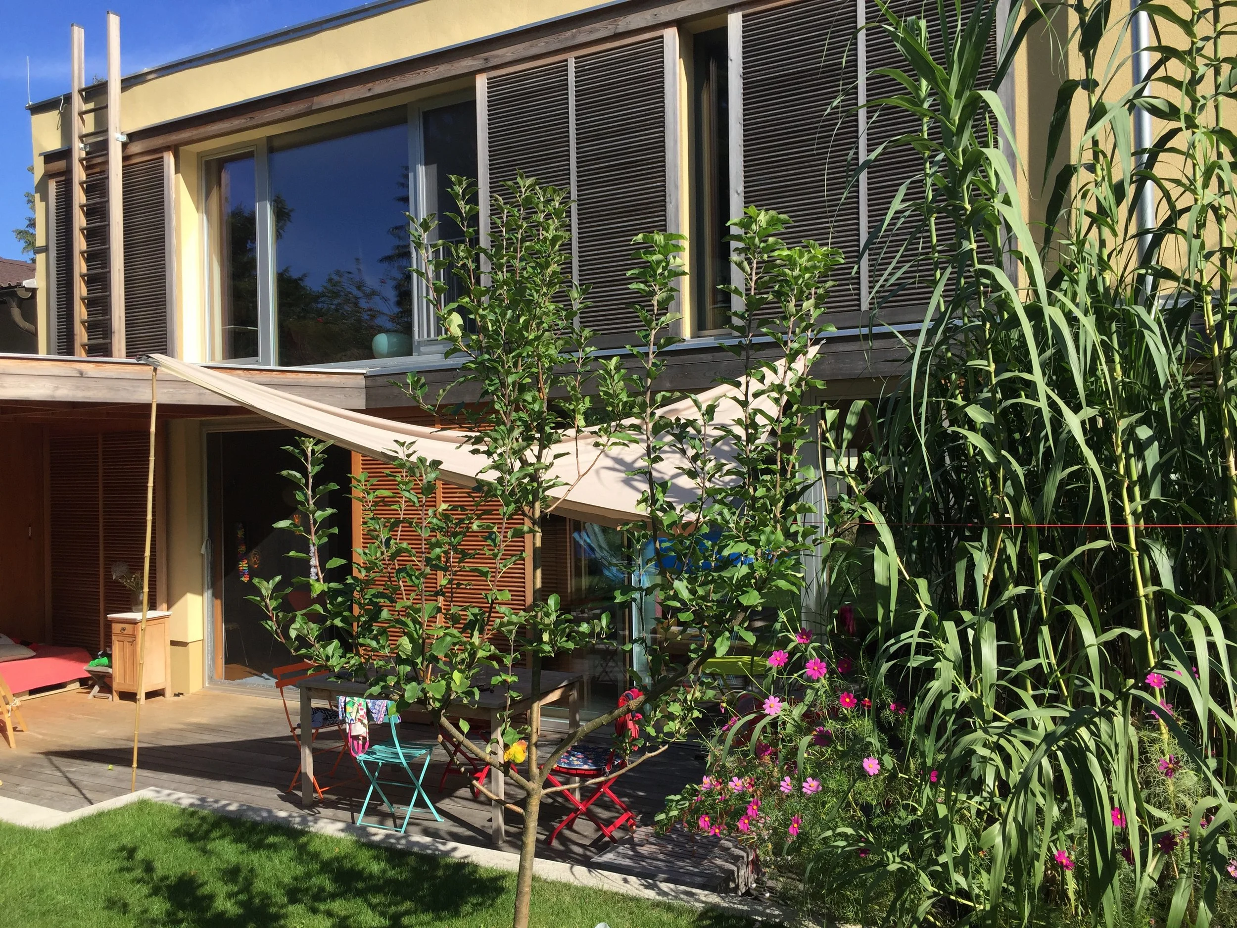 Das 2014 fertiggestellte Einfamilienhaus wurde in Ziegelmassivbauweise errichtet und mit 18cm dicker Hanfdämmung eingepackt. Decken und Keller sind aus Beton und auf Sicht belassen. Im Inneren des Hauses erzeugen naturbelassene Materialien und Oberflächen mit unterschiedlichen Texturen eine warme und behagliche Atmosphäre. Durch die L-Form des Grundrisses ergeben sich die verschiedenen Wohnbereiche ganz von alleine, im Erdgeschoß gibt es bis auf den Sanitärbereich keine einzige Zwischenwand. Im Obergeschoß wurden Holzständerwände installiert, die auch wieder leicht abgebaut werden können wenn sich die Bedürfnisse ändern: Kinder ausziehen, Arbeitsräume nicht mehr gebraucht werden etc.